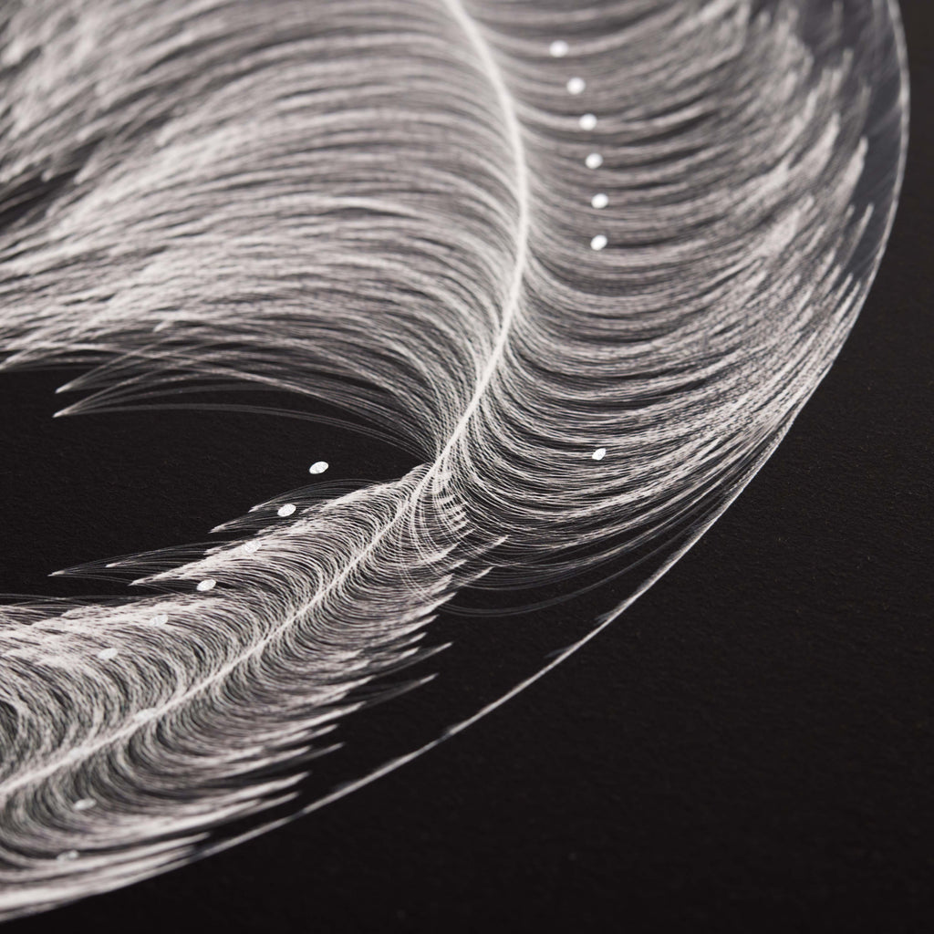 Archival pigment print on Hahnemuhle German Etching 310gsm, with cut edges to finish. Hand-finished by the artist with chrome ink details