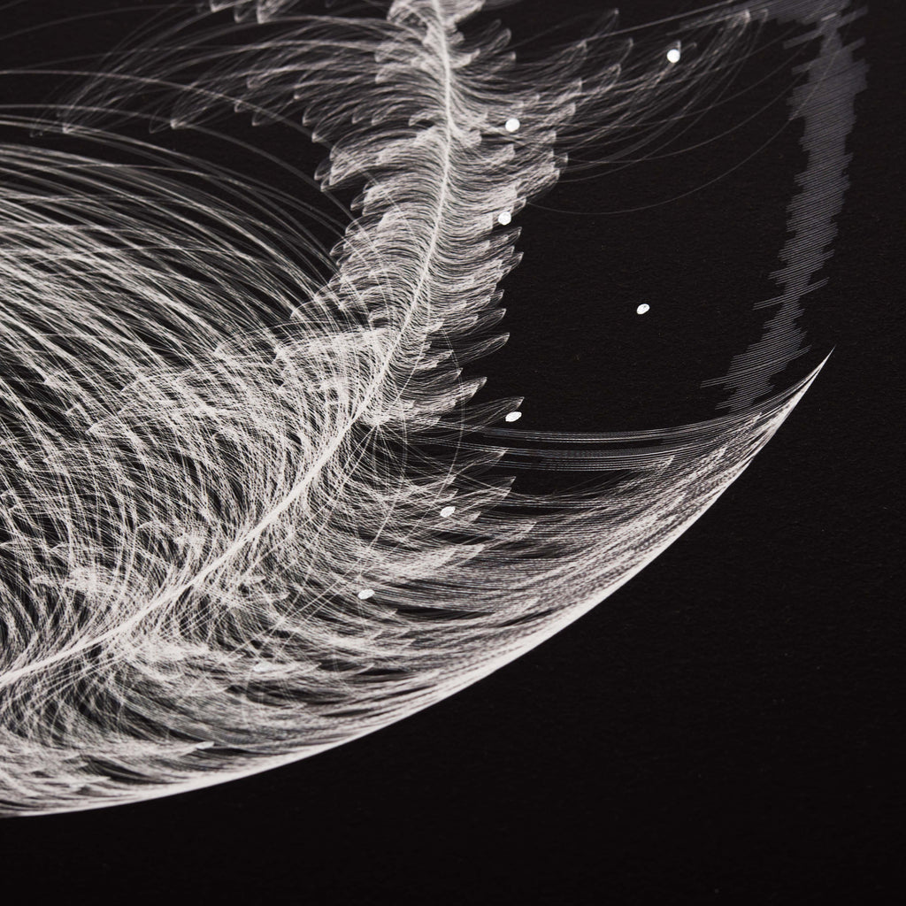 Archival pigment print on Hahnemuhle German Etching 310gsm, with cut edges to finish. Hand-finished by the artist with chrome ink details