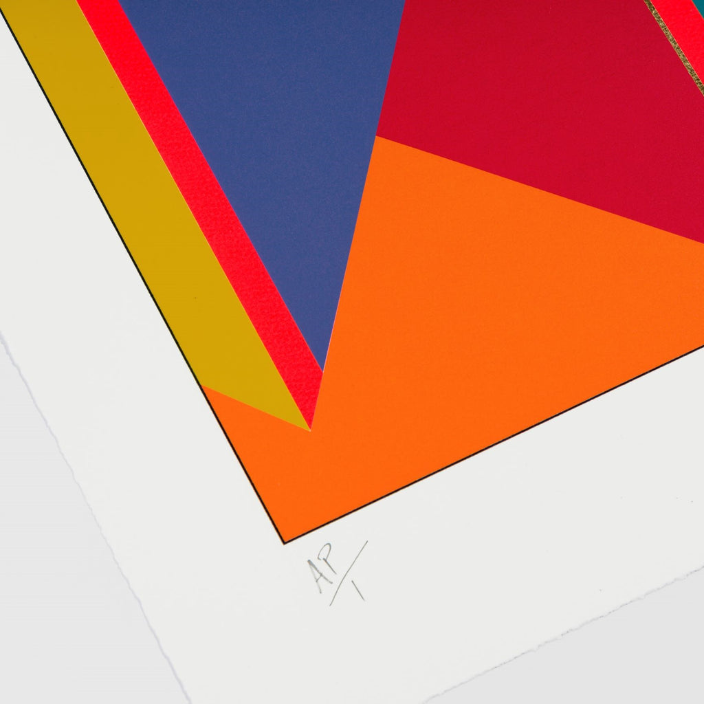 7 colour screen print with metal leaf embellishment on Somerset Velvet White 300 gsm paper with torn edges to finish.