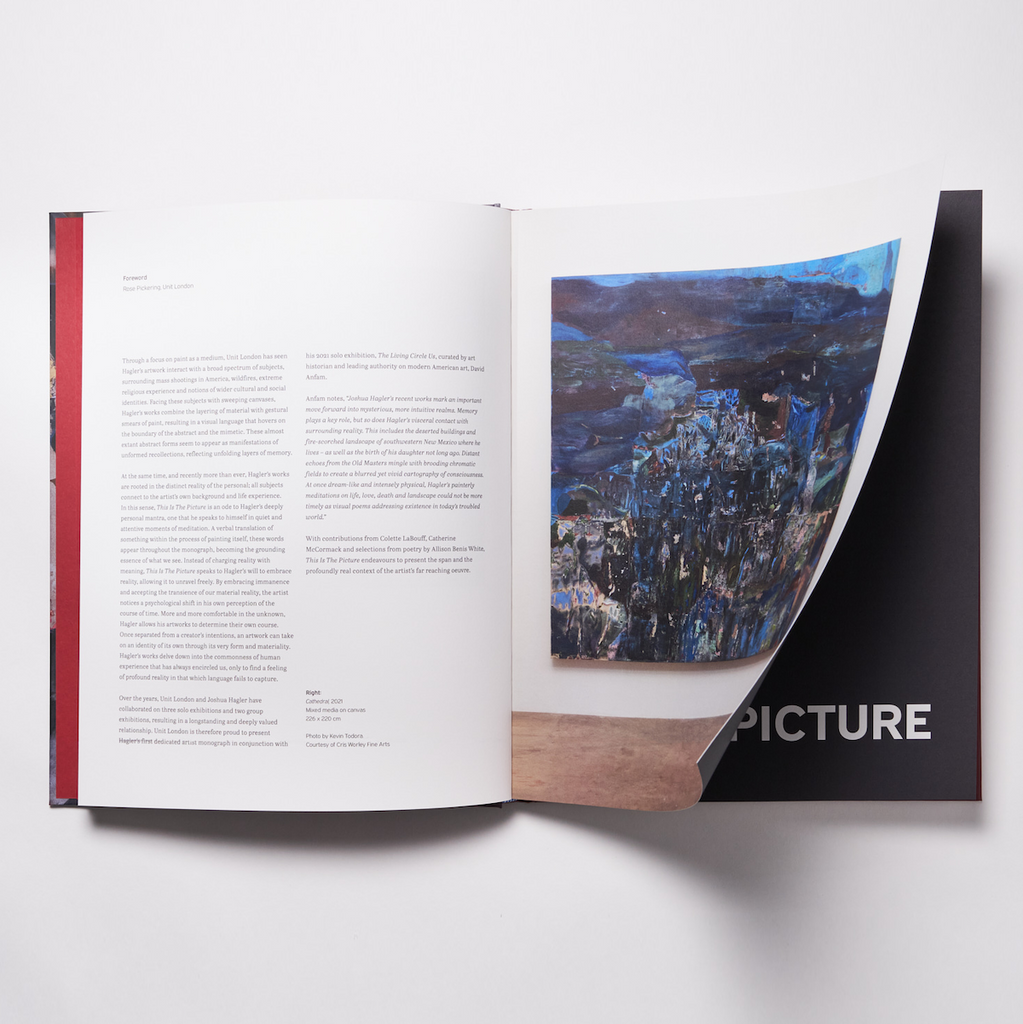 Over the years, Unit London and Joshua Hagler have collaborated on three solo exhibitions and two group exhibitions, forming a longstanding and deeply valued relationship. Unit London is therefore proud to present Hagler’s first dedicated artist monograph to coincide with his 2021 solo exhibition, The Living Circle Us. The monograph, entitled This Is The Picture, features contributions from Colette LaBouff, Catherine McCormack and selections from poetry by Allison Benis White. This Is The Picture explores the artist’s expansive oeuvre as, over time, it has interacted with a broad spectrum of subjects, surrounding mass shootings in America, wildfires, extreme religious experience and wider cultural and social identities.